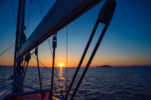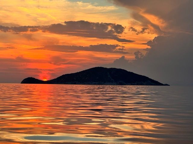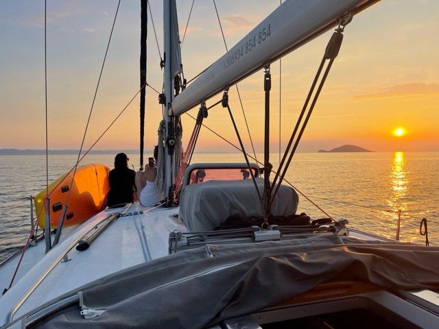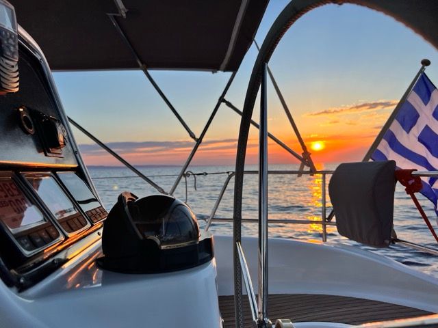 We sail out from the Kassandra peninsula into the open sea to enjoy the stunning sunset views over the horizon, capturing unforgettable photos and peaceful moments.