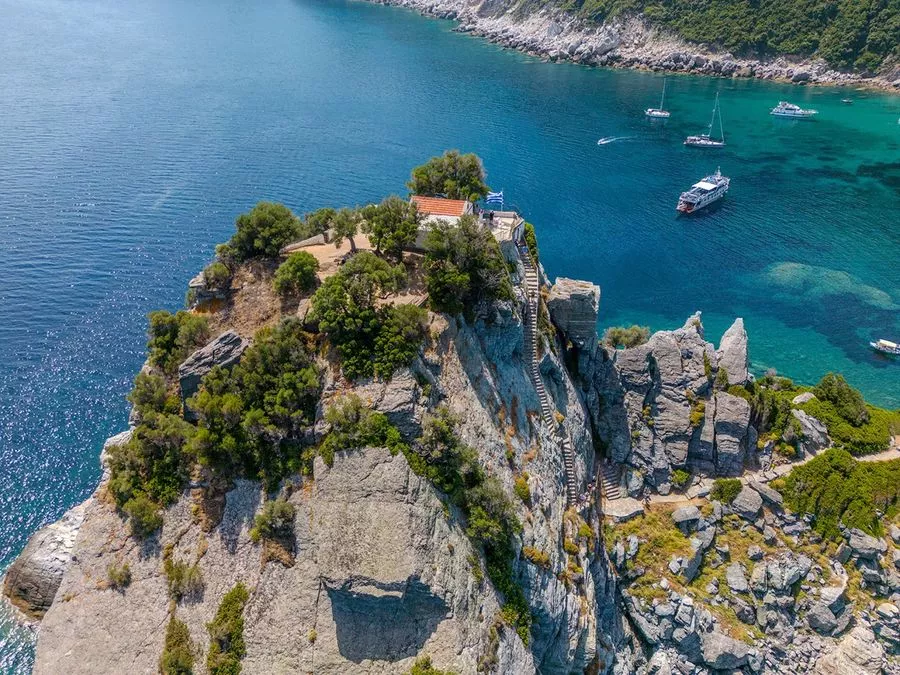 Then we sail to the church of Ag. Ioannis, where the movie “Mama mia” was filmed. There we will walk up to the rock where the church is built and we will also have time for swimming.